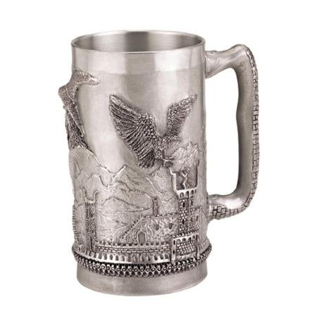 Depicted on the Gandalf tankard is this wizard's daring escape from Saruman's tower. It shows the Great Eagle of the Mountain, Gwaihir the Windlord, with its wide sweeping wings descending upon the pinnacle Orthanc. In another scene, Gandalf is featured battling against the ferocious Balrog upon the Bridge of Khazad-dum. A profile of Gandalf with his long flowing beard and deep-set eyes exudes a quiet mystique.14.5cm H